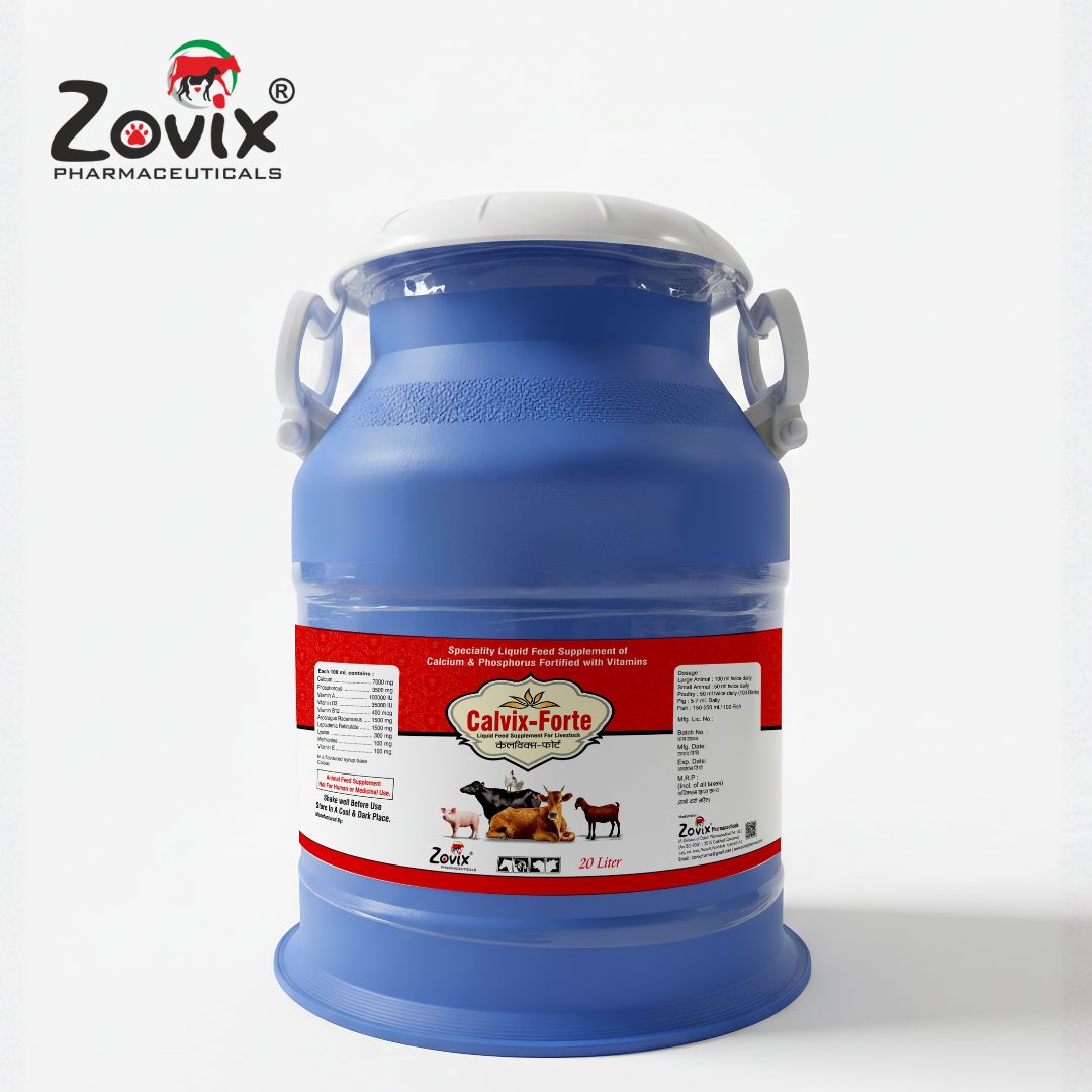 CALVIX-FORTE is a high-quality calcium supplement designed to enhance bone health, milk production, and reproductive efficiency in livestock. With its powerful blend of minerals, vitamins, and herbal extracts, it is an essential choice for dairy farmers and livestock owners.