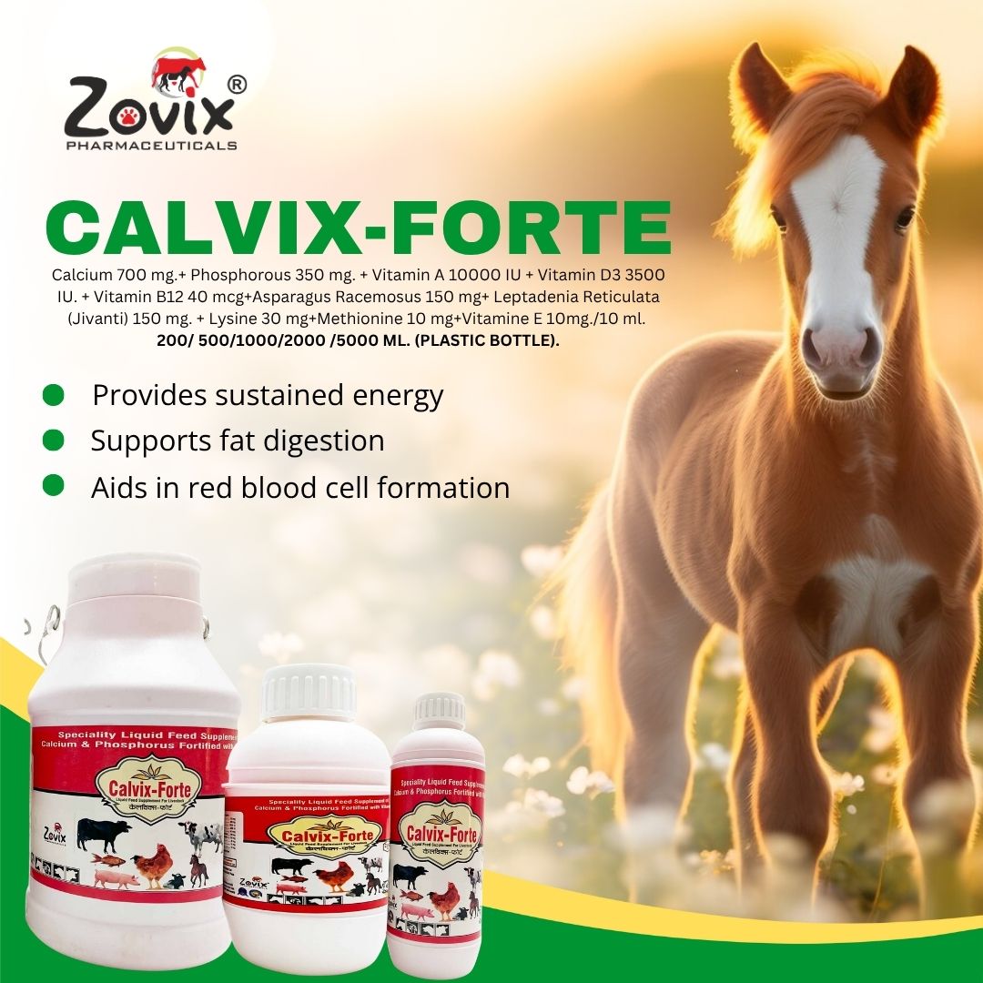 CALVIX-FORTE is a high-quality calcium supplement designed to enhance bone health, milk production, and reproductive efficiency in livestock. With its powerful blend of minerals, vitamins, and herbal extracts, it is an essential choice for dairy farmers and livestock owners.