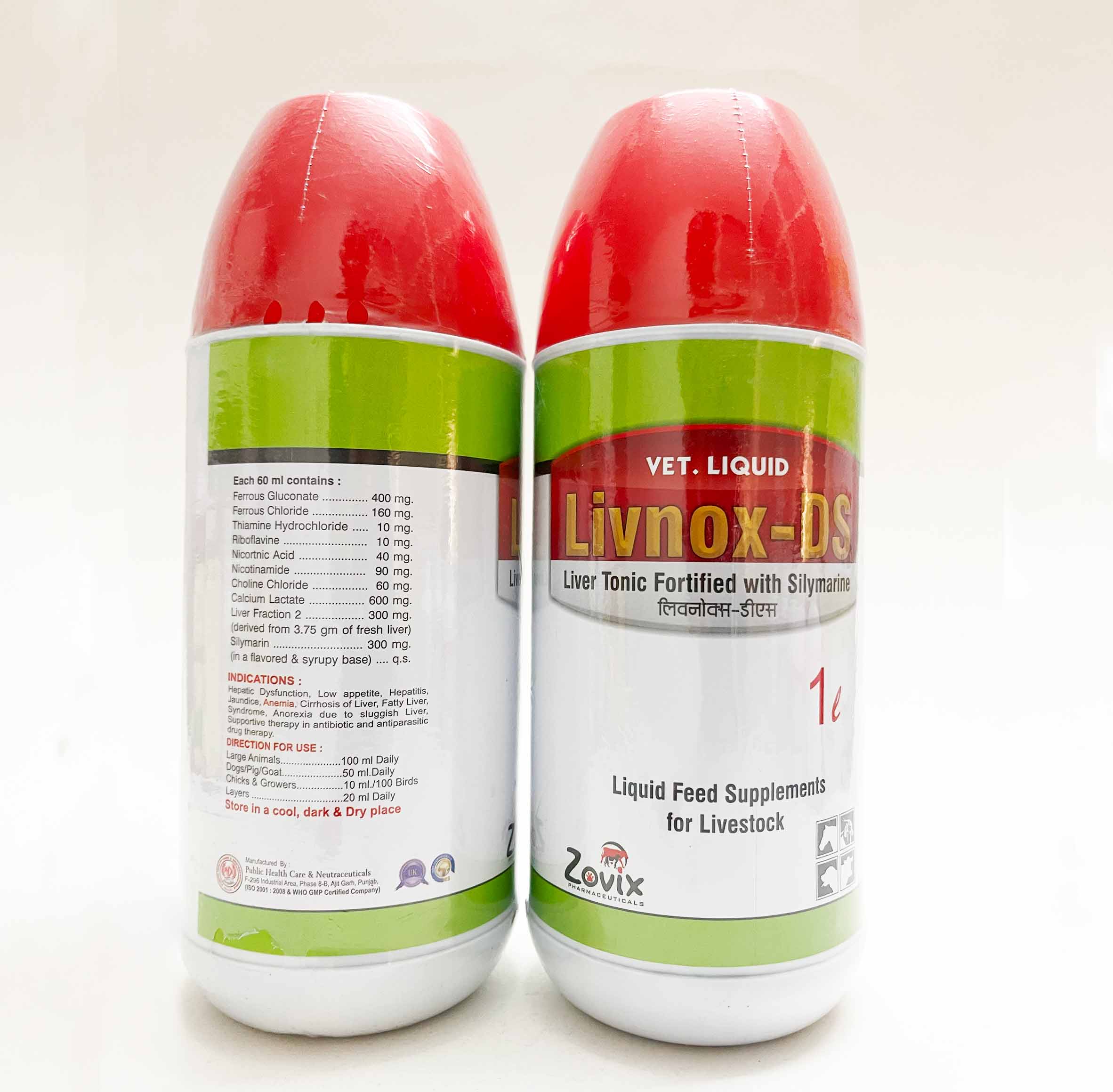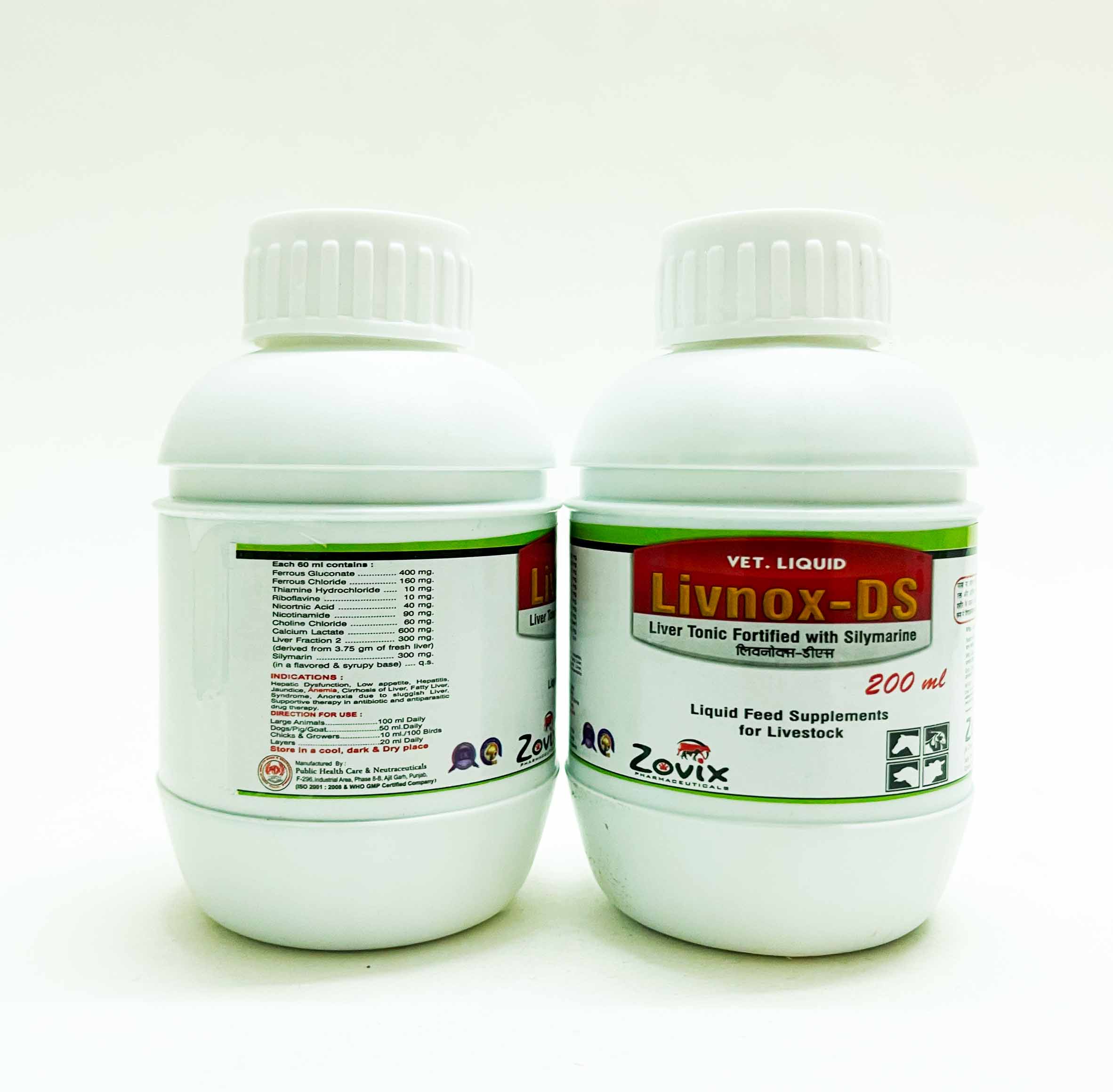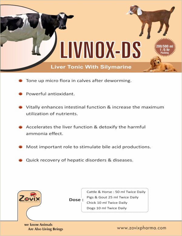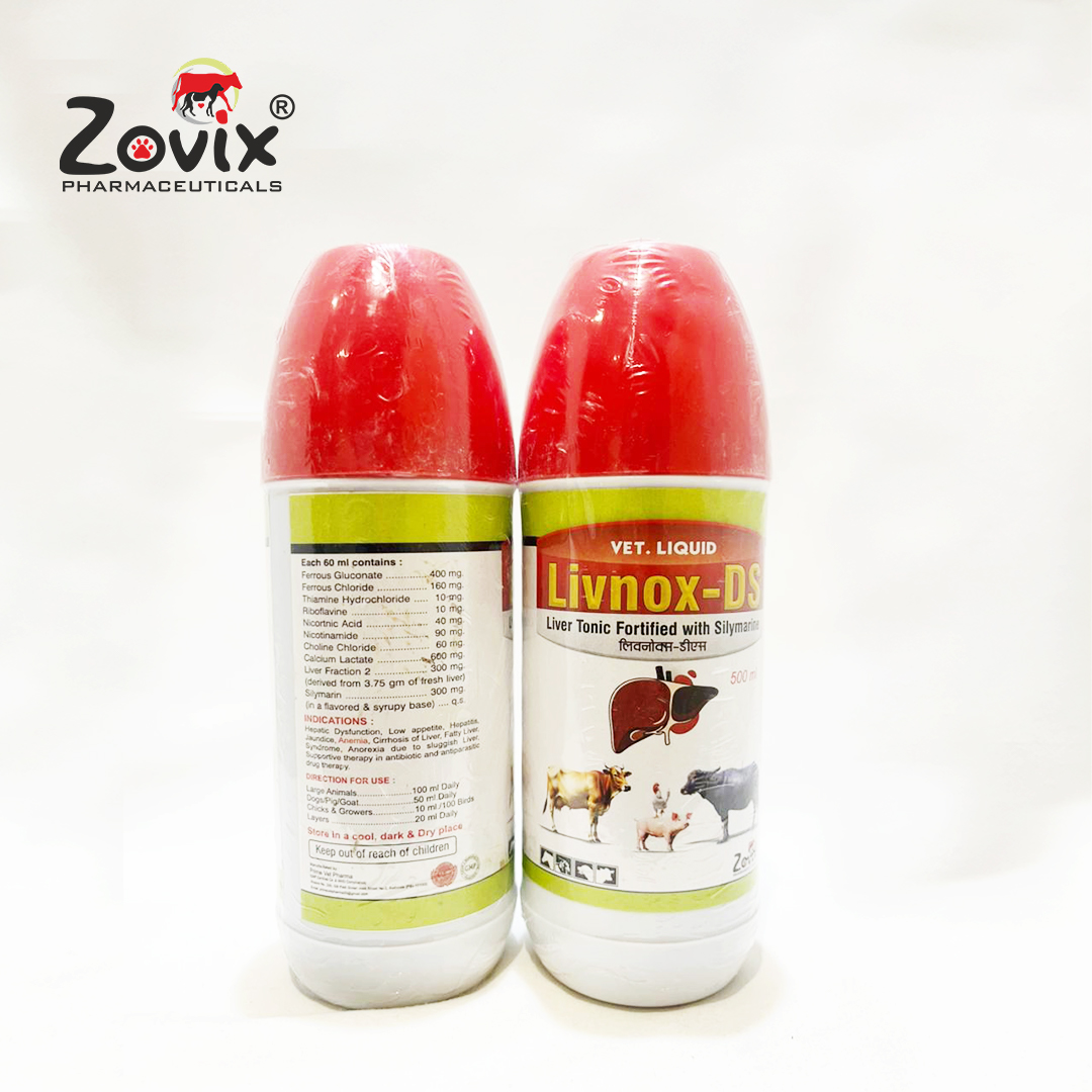 LIVNOX-DS is a scientifically formulated liquid feed supplement designed to enhance liver function, improve blood health, and boost overall metabolism in cattle, poultry, and other farm animals. It contains ferrous gluconate, liver fraction, and silymarin to support iron absorption, detoxification, and optimal performance.